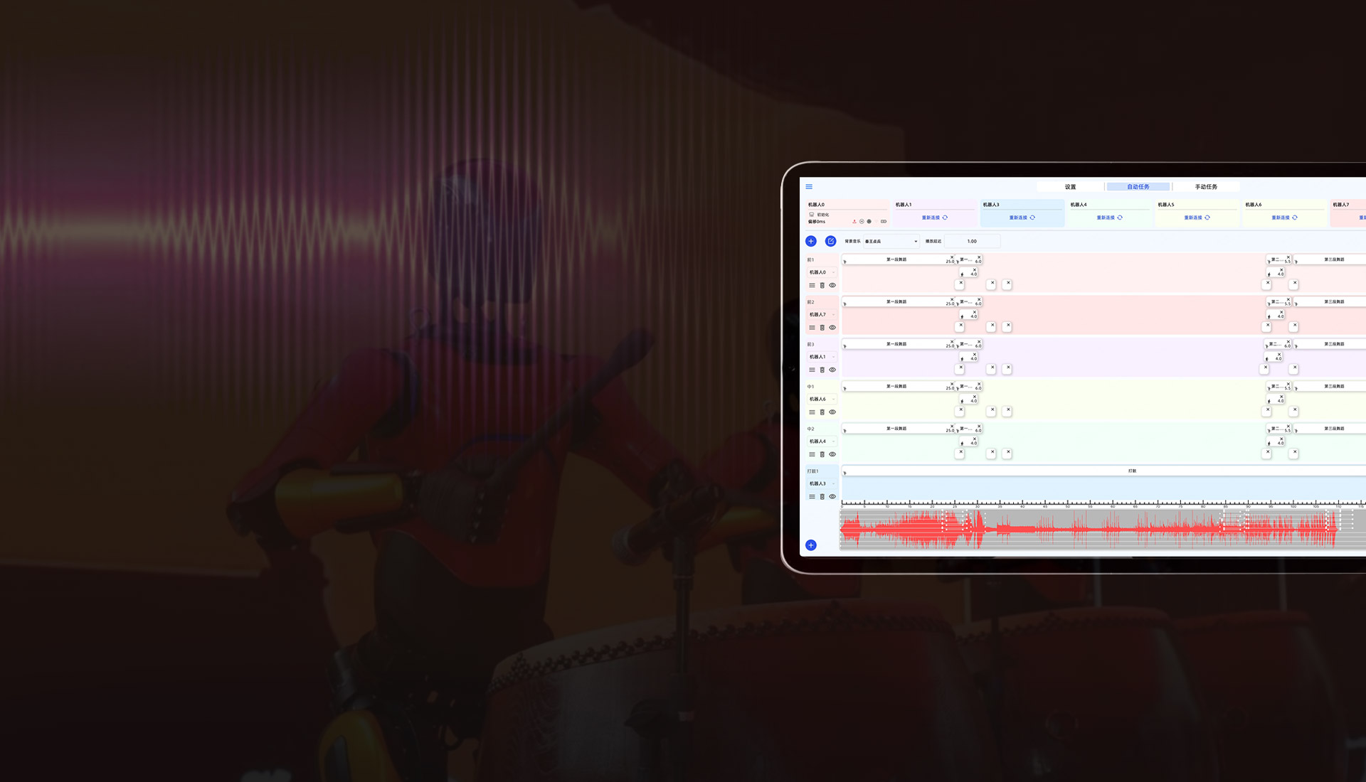 机器人表情、动作、语音、行走速度、时长自由设置。 动作时序拖拉、组合,群控规划如此易如反掌!